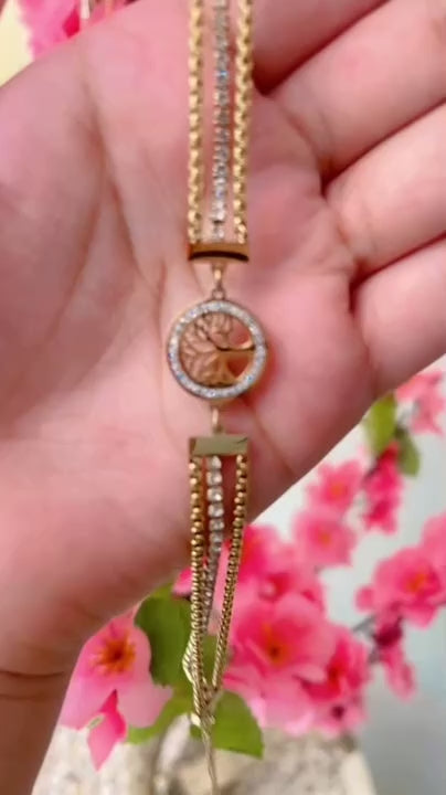 Celebrate elegance, strength, and symbolism with the JewelTrix Tree of Life Bracelet. This beautifully crafted bracelet features a dual-chain design adorned with shimmering crystals and a central Tree of Life charm—symbolizing growth, balance, and connection. The round charm is encircled by a halo of clear stones, creating a stunning focal point that radiates sophistication.